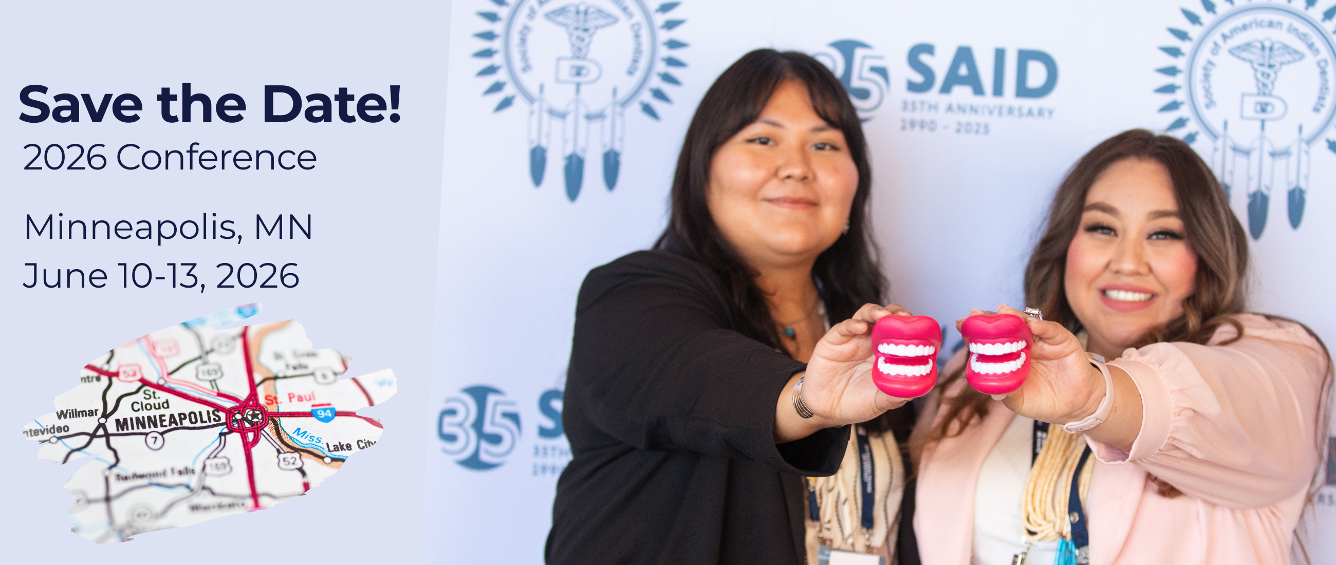 The Society of American Indian Dentists (SAID) Conference is scheduled for June 10-13, 2026, in Minneapolis, MN. Members and friends will gather to celebrate our 36th gathering. We will honor our cultures, learn from other dental professionals and each other, as well as network and engage with each other, industry leaders, and partners. Save the date! Details coming soon. Questions? Please contact SAID at [email protected].